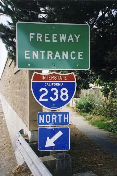 This entrance is on Hesperian Boulevard just inside San Lorenzo. North Interstate 238 really is headed in a west-northwesterly direction.