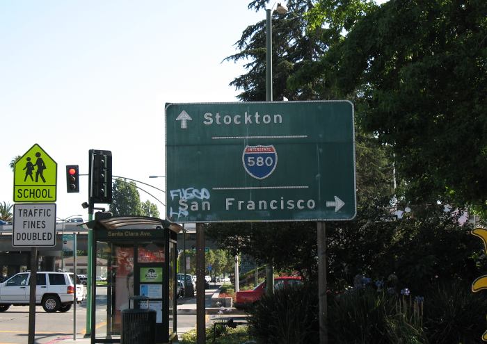 Aside from showing the older-style button reflectors still common on California signs, this destination sign at a freeway entrance from Grand Avenue in Oakland shows something a bit odd. The destination for this sign usually would be San Leandro or Hayward, both not so far away along Interstate 580. But Stockton? To reach Stockton from this point requires following Interstate 580 until reaching Interstate 205 in San Joaquin County. That's almost an hour and a half from this point on a good day. San Francisco is much closer.