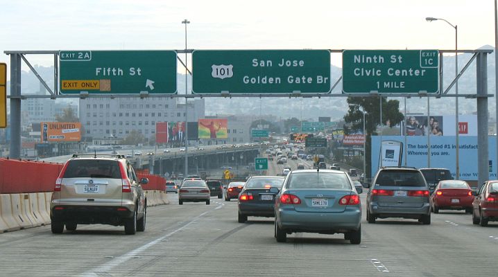 The center panel on this sign assembly on westbound Interstate 80 at Fifth Street in San Francisco is marked for US 101, not for Interstate 80. That's because the Interstate 80 designation ends at the Central Skyway. The main freeway route continues southward as US 101.