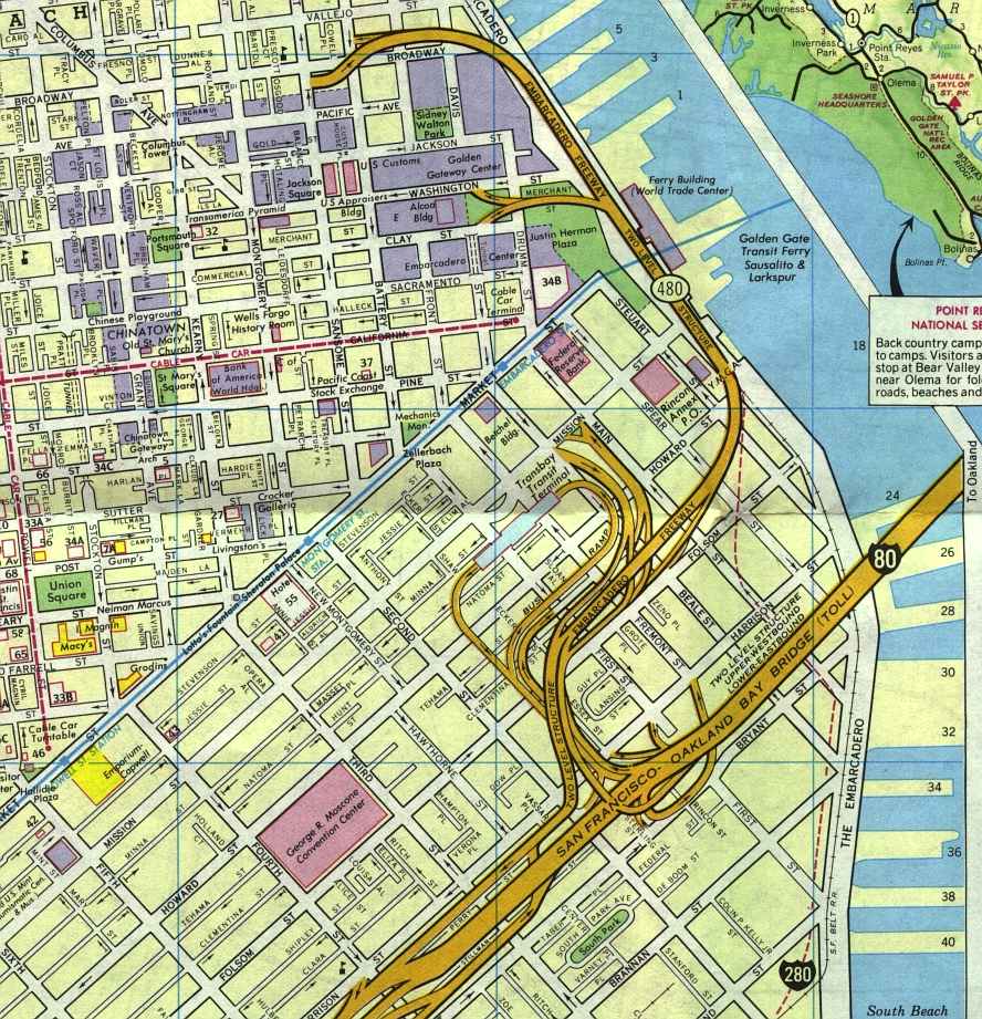 This is probably one of the last maps that was published before the 1989 Loma Prieta earthquake. The H.M. Goushá map (fair use excerpt below) shows freeways that since have been torn down, notably the Embarcadero Freeway. The elimination of the freeway allowed substantial renovation on the Embarcadero itself, as well as the Ferry Building, resulting in one of the great urban boulevards.