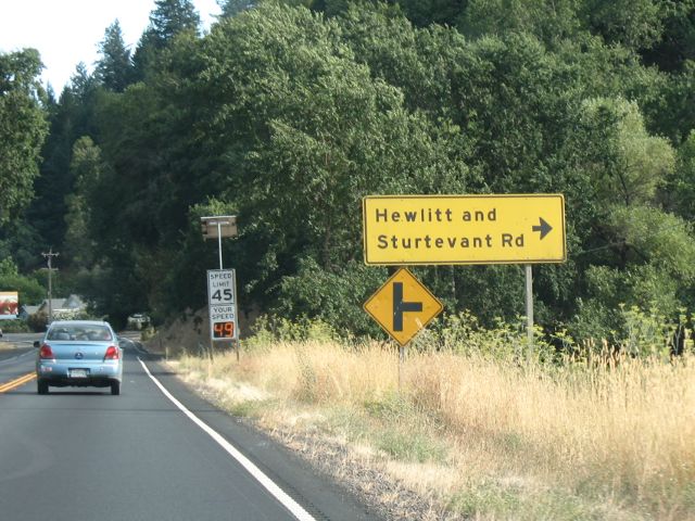 This is one of several directional signs for local roads intersecting with US 101 southbound in and near Hopland. Normally, these signs should have white lettering on a green background. The Hopland-area signs use black lettering on a yellow background, a scheme more commonly associated with warning signs.