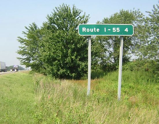 It's almost the end for Interstate 57 in Missouri. This destination sign in Mississippi County indicates that Interstate 55 is four miles away. At that point, Interstate 57 ends and the route continues into Sikeston as US 60.