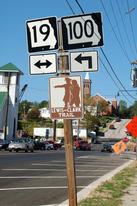 Lewis and Clark are pointing the same way that Missouri 100 goes where First and Market Streets intersect in Hermann. The two routes are concurrent north-south on Market Street through the Gasconade County seat.