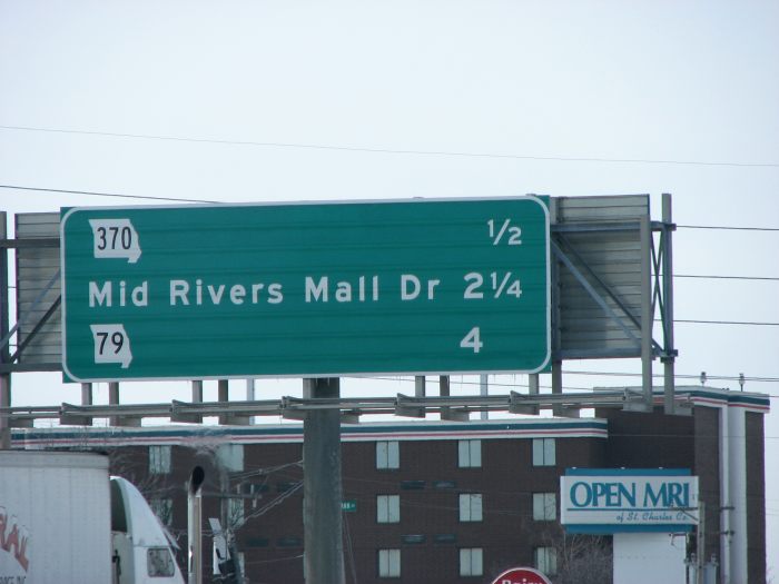 Route-marker shields began showing up on Missouri freeway signs in the Columbia and Springfield areas around 2005, and have since appeared in the St. Louis area. This sign is on Interstate 70 westbound just west of the Cave Springs exit in St. Peters.