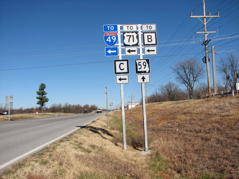 This sign assembly ("sine salad", if you will) on Missouri 59 in Goodman displays all route types in Missouri, not counting business routes.