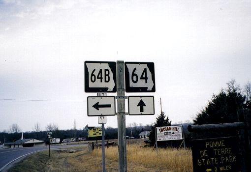 Missouri 64B is one of only two Missouri highways with a letter suffix (the other one is Missouri 64A). It's a two-mile spur into the Pomme de Terre State Park on the south side of Pomme de Terre Lake in Hickory County.