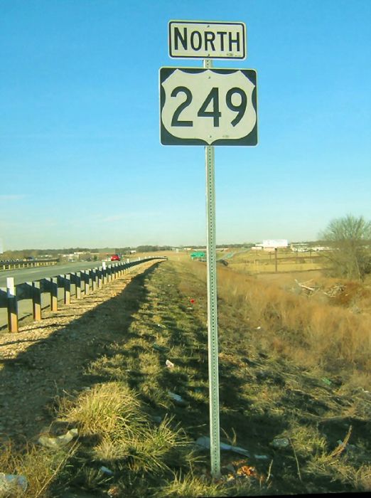 It's not US 249, but Missouri 249, running just to the east of Joplin. This is one of several mistaken markers that David Backlin found along the route in December 2006. This not-so-reassuring reassurance marker is just north of Missouri 249's southern endpoint at Interstate 44.