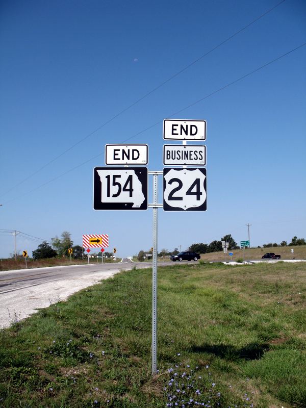 Both Missouri 154 and Business US 24 have their western endpoints at US 24 on the west side of Paris. The Missouri 154 marker uses the "wide" rectangular style, yet the "End" banner isn't centered above the marker as it should be. Other than that, there were few worries when this photo was taken in September 2012.